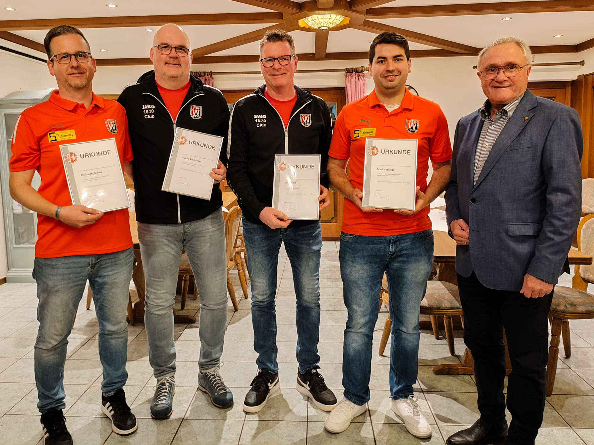 Zudem zeichnete der FLVW, vertreten durch Joachim Schlüter, Mario Schönauer, Marius Gerigk, Timo Nöll und Christian Breuer mit der Verdienstnadel in Silber aus. Auch die Verabschiedung von Stefan Jung und Julio Marques Correia aus dem Jugendvorstand wurde von großem Dank und Anerkennung begleitet.