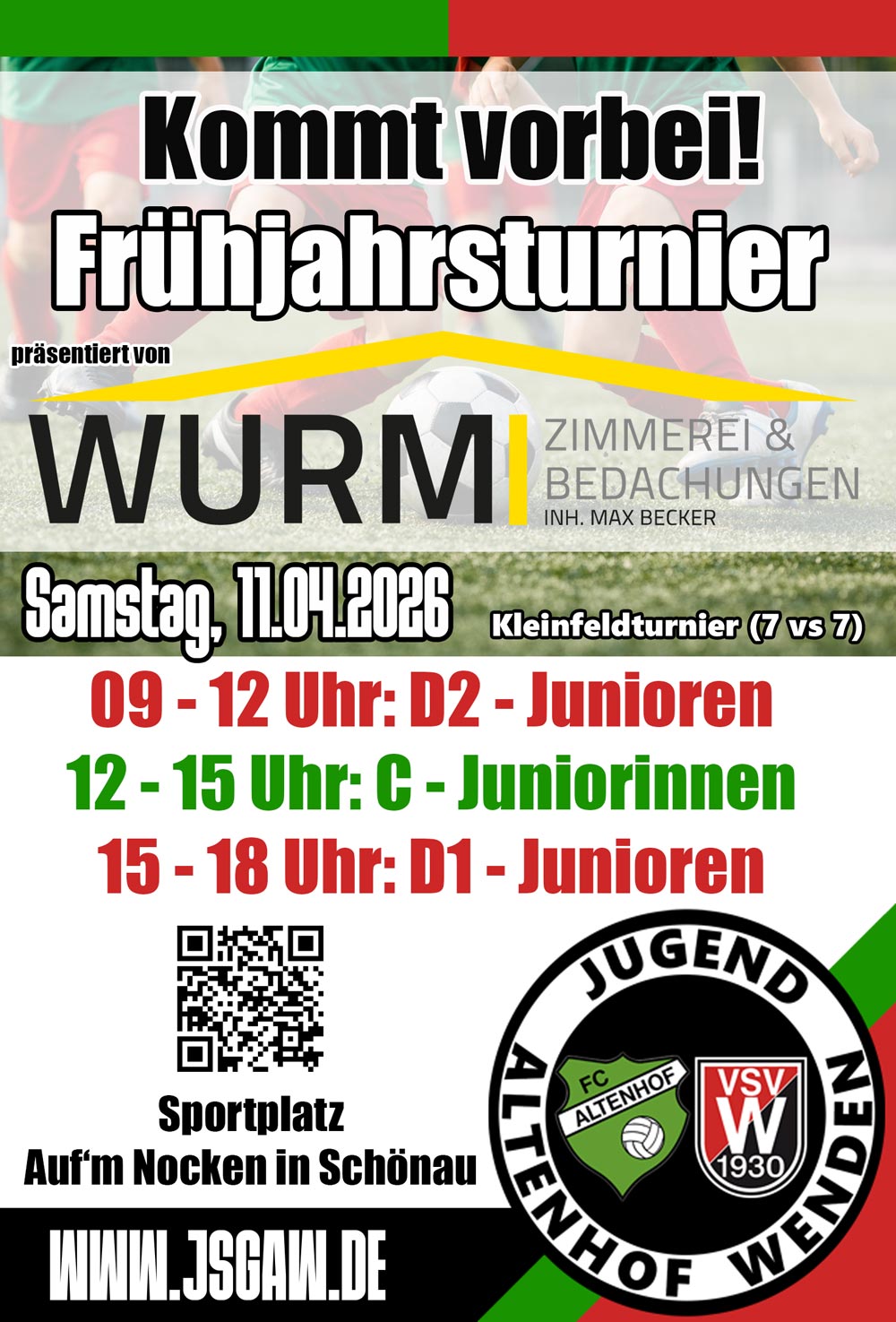 Am Samstag, den 11. April 2026, findet auf dem Sportplatz „Auf’m Nocken“ in Schönau das Frühjahrsturnier der JSG Altenhof/Wenden statt. Präsentiert wird das Turnier von Wurm Zimmerei & Bedachungen.