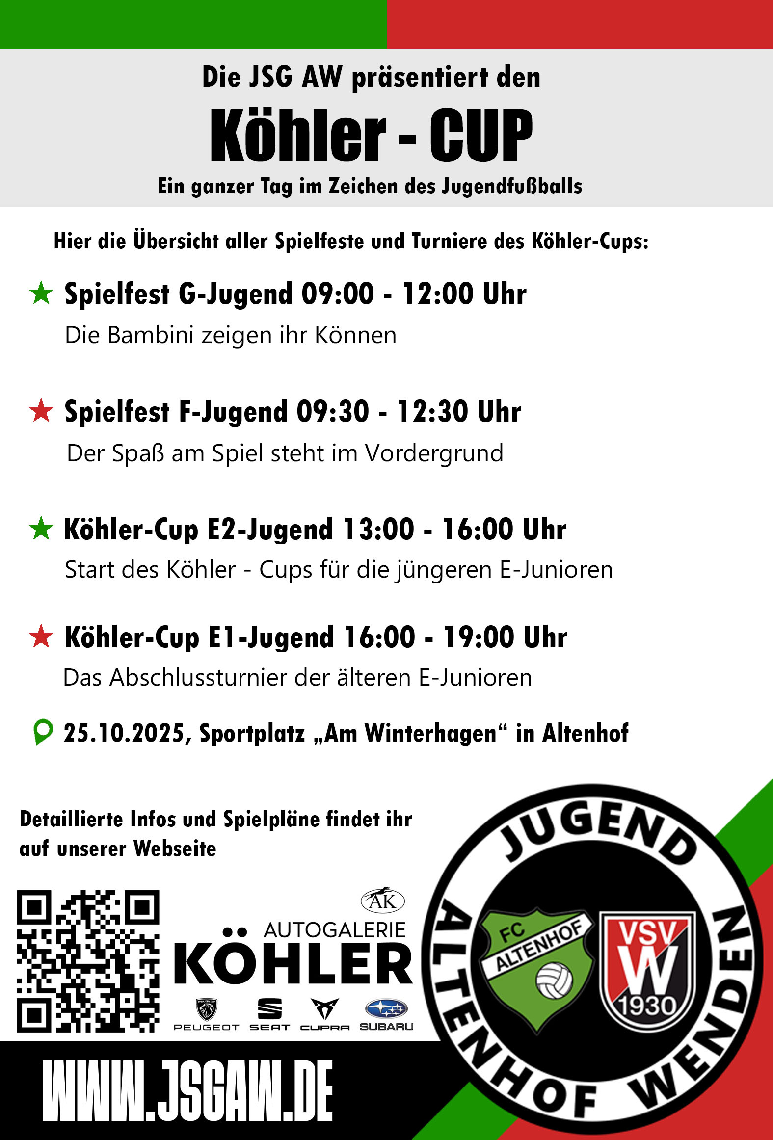 Die JSG AW freut sich, euch am Samstag, den 25. Oktober 2025, zum großen Köhler-Cup auf dem Sportplatz „Am Winterhagen“ in Altenhof einzuladen!