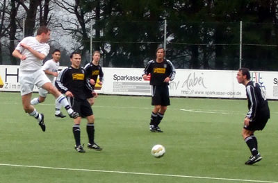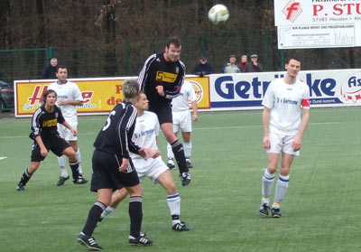 Beste Chance im Spiel. Alex Kofler trifft per Kopf die Latte nach einer Ecke von Olli Rempel.