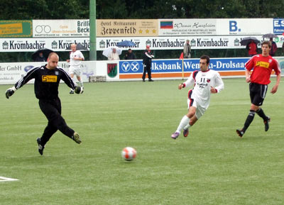 Kurze Zeit später war Dennis Zeppenfeld durch, wurde aber vom Keeper im 16er umgelegt. Der Elfmeterpfiff blieb aus, statt dessen sah Dennis für seinen berechtigten Einwand Gelb...
