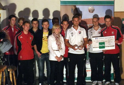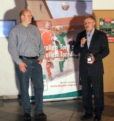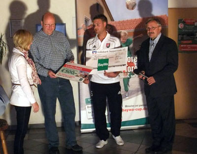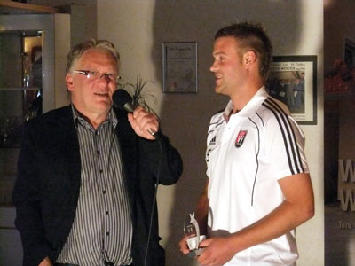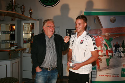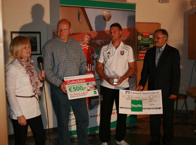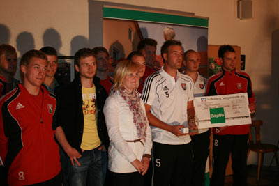 Oliver bekam unter den Augen vieler VSV - Fans und seiner Mannschaft für sein Tor von Frau Klaas einen Ipod Nano, sowie einen Pokal und einen Barscheck für die Mannschaftskasse in Höhe von 500 Euro überreicht.