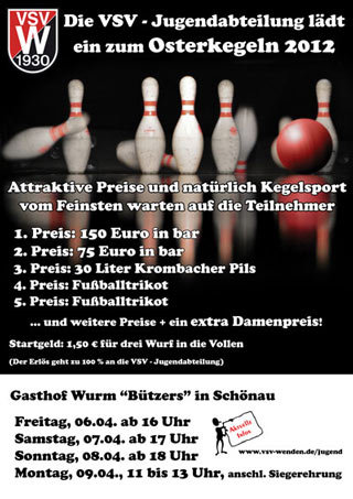 Vom 06.04. bis zum 09.04.2012 findet im Gasthof Wurm "Bützers" in Schönau wieder das traditionelle Osterkegeln der Jugendabteilung des VSV Wenden statt.