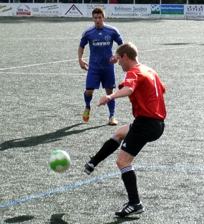 Leider nicht wirklich lange, denn nur zwei Minuten später ging die Germania erneut in Führung. Durch den Rückstand ließ sich das Hütte - Team aber glücklicherweise alles andere als beirren und spielte einfach weiter Fußball. Die erste Belohnung gab es in der 77.Minute, als Timo Halbe nach schönem Zuspiel von Andre Zeppenfeld ausgleichen konnte. Das sollte es aber noch nicht gewesen sein, denn Marcel hatte sieben Minuten vor dem Ende nach einer ohnehin schon blitzsauberen Leistung seinen großen Auftritt, indem er das Leder per Freistoß über die Mauer in den rechten Winkel knallte. Grandios und gleichzeitig der Siegtreffer!