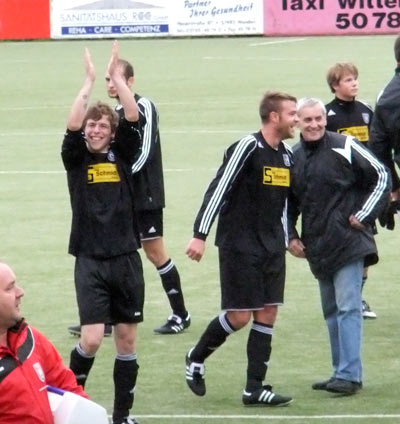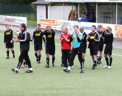 Nach dem Wiederanpfiff gab der gesamte VSV, also Fans und Mannschaft, Gas. Es dauerte auch nicht lange, ehe in Schönau zum ersten Mal gejubelt werden konnte. Jens Solbach setzte sich auf links durch und seine Flanke fand in Timo Halbe einen dankbaren Abnehmer, fortan stand es nur noch 1:2. Zwei Minuten später scheiterte Timo aus der Drehung am gegnerischen Keeper, in der 60. Minute knallte es aber erneut: Freistoß Tom Haselbach, Kopfball vom Trainer, Torwart, Marco Bäumer ist zur Stelle und trifft zum Ausgleich! Danach brannte der Nocken und unsere Mannschaft schaffte mit einer Energieleistung tatsächlich noch den Siegtreffer. Andre Zeppenfeld schnappt sich ein Zuspiel von Thomas Hütte, geht zur Grundlinie, setzt sich durch, bringt den Ball an den 5er und Timo Halbe vollstreckt in der