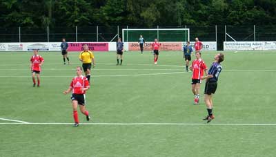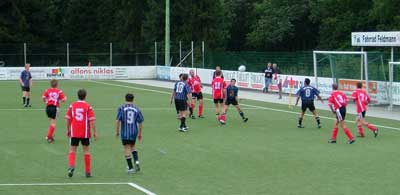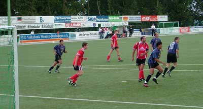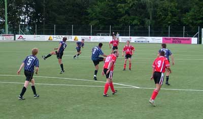 Die ersten 10 Minuten plätscherte das Spiel vor sich hin. Unsere Mannschaft kam dann jedoch immer besser ins Spiel, nach 15 Minuten war es dann soweit. Stefan Halbe zog aus 25 Metern ab und knallte den Ball zum 1:0 unter die Latte. Von nun an lief das Spiel auf ein Tor. Jens Schneider machte es Stefan Halbe nur 8 Minuten später nach und traf aus gleicher Distanz und genauso schön zum 2:0. Nur fünf Minuten später traf Alex Arns aus 16 Metern halbhoch ins linke Eck. Mit dem Halbzeitpfiff erzielte Mentor Hajdari nach einem Torwartfehler das 4:0.