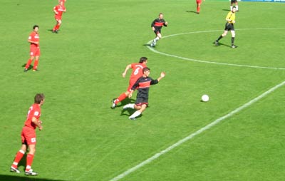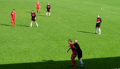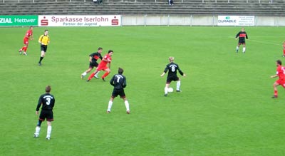 Die ersten zwanzig Minuten lief das Spiel nur in Richtung Iserlohner Tor. Allein zwischen der 10. und 15. Minute wurden vier hochkarätige Chancen ausgelassen, Miki Frtunic scheiterte z.b. am Pfosten. Danach drehte sich das Spiel fast völlig, unsere Mannschaft war auf einmal vollkommen von der Rolle. Iserlohn erarbeitete sich einige gute Möglichkeiten, scheiterte aber an Torwart Andi Klein. In der 44. Minute war aber auch er machtlos, Iserlohn ging nach einer Ecke mit 1:0 in Führung.