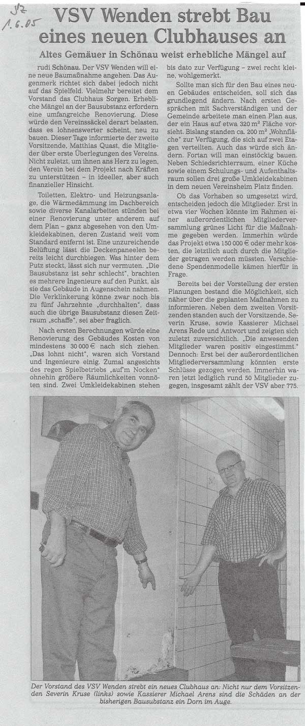 (rudi) Schönau. Der VSV Wenden will eine neue Baumaßnahme angehen. Das Augenmerk richtet sich dabei jedoch nicht auf das Spielfeld. Vielmehr bereitet dem Vorstand das Clubhaus Sorgen. Erhebliche Mängel an der Bausubstanz erfordern eine umfangreiche Renovierung. Diese würde den Vereinssäckel derart belasten, dass es lohnenswerter scheint, neu zu bauen. Dieser Tage informierte der zweite Vorsitzende, Matthias Quast, die Mitglieder über erste Überlegungen des Vereins. Nicht zuletzt, um ihnen ans Herz zu legen, den Verein bei dem Projekt nach Kräften zu unterstützen in ideeller, aber auch finanzieller Hinsicht.