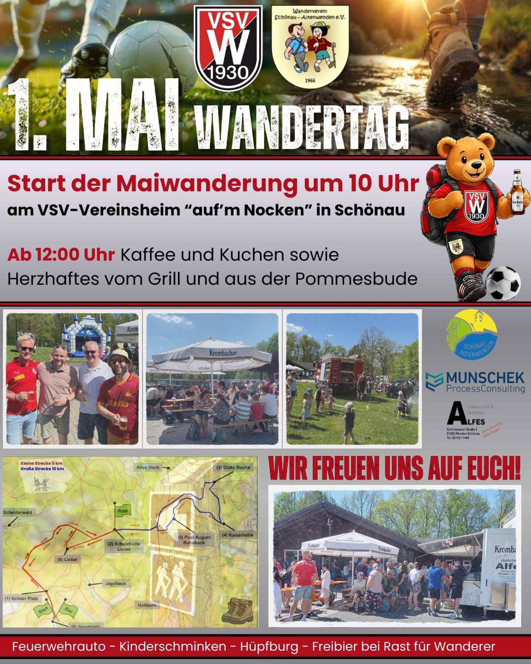 Wenn der Mai beginnt, sind in Schönau wieder alle Generationen eingeladen, gemeinsam den Tag zu verbringen. Der Wanderverein Schönau-Altenwenden und der VSV Wenden laden auch in diesem Jahr zur traditionellen Maiwanderung ein und freuen sich auf zahlreiche Teilnehmer.